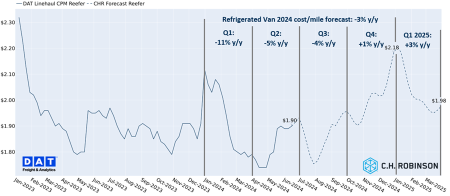 Unsere Prognose für den Kühltransport im Fernverkehr im Jahr 2024 wurde im Vergleich zum letzten Monat ebenfalls gesenkt. Die temperaturkontrollierte Prognose für 2024 liegt bei -3 % im Jahresvergleich, verglichen mit den zuvor angegebenen -1 %.