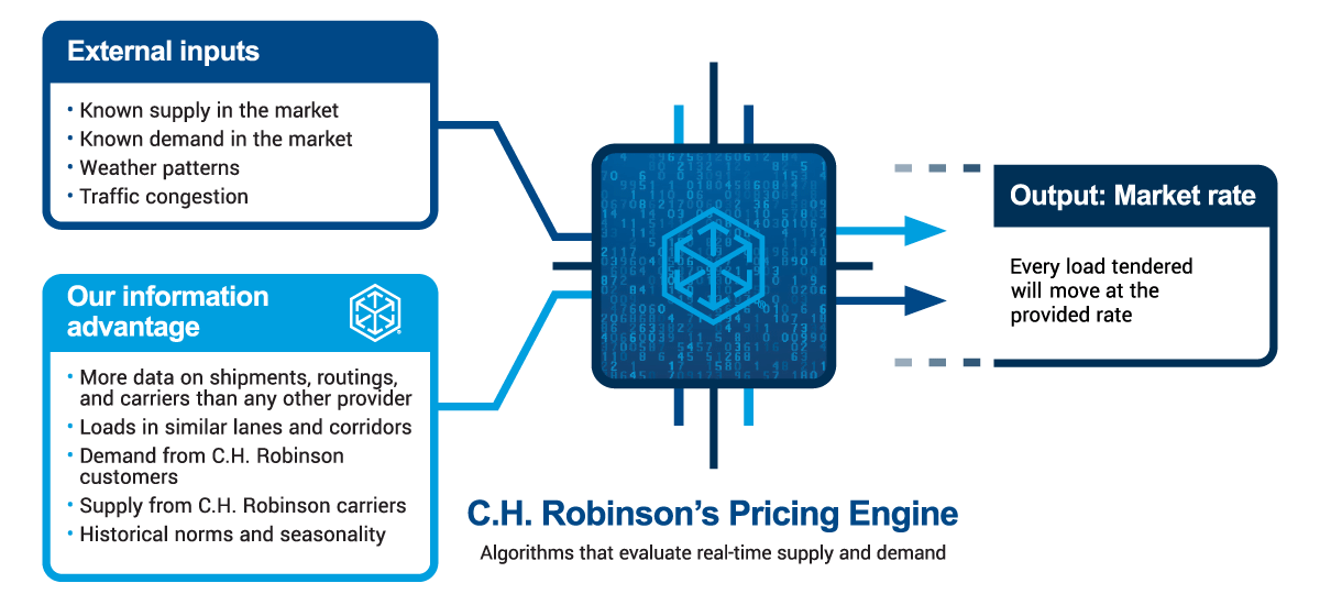 C.H. Robinson's highly connected, algorithmic-based pricing engine pulls data from our network of more than 200,000 shippers and carriers—accessing more data on real-time supply and demand, routes, and shipments than any other provider.