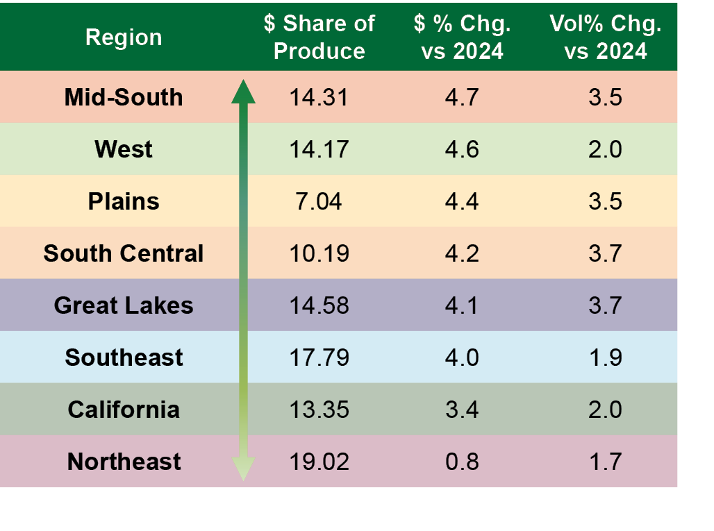• Through the first four weeks, produce dollars grew 3.6%, while volume sales are trending up 2.7% vs 2024.