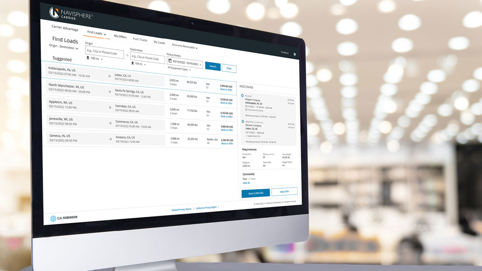 Voyez les options de fret adaptées à vos besoins. Profitez de la flexibilité de la plate-forme la plus connectée au monde, Navisphere®, pour consulter notre tableau des chargements gratuit, trouver et réserver des chargements, maximiser vos revenus et garder vos camions pleins, quel que soit l'endroit où vous préférez travailler. Navisphere Carrier vous met en relation avec des fonctionnalités qui vous aident à tirer le meilleur parti des chargements que vous aimez, à tout moment.
