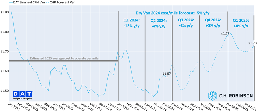La nostra previsione di costo per il trasporto di furgoni secchi per il 2024 è stata ridotta da -2% a -5% di variazione su base annua. Diversi fattori sottostanti sia alla domanda che all'offerta influenzano le nostre modifiche alle previsioni. Dal lato dell'offerta, continuiamo a trovarci in una lunga fase di eccesso di offerta. Nel nostro Rapporto Robinson dell'ottobre dello scorso anno, abbiamo discusso i due fattori principali che causano questo: