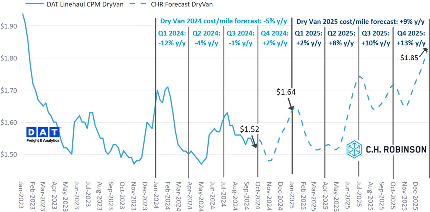 La previsione C.H Robinson del costo per miglio del trasporto di linea di furgoni asciutti nel 2024 rimane relativamente invariata, pari a -5% su base annua (a/a). Questo mese include anche le previsioni per il 2025, che prevedono un aumento del 9% rispetto al costo per miglio dell'intero anno 2024.