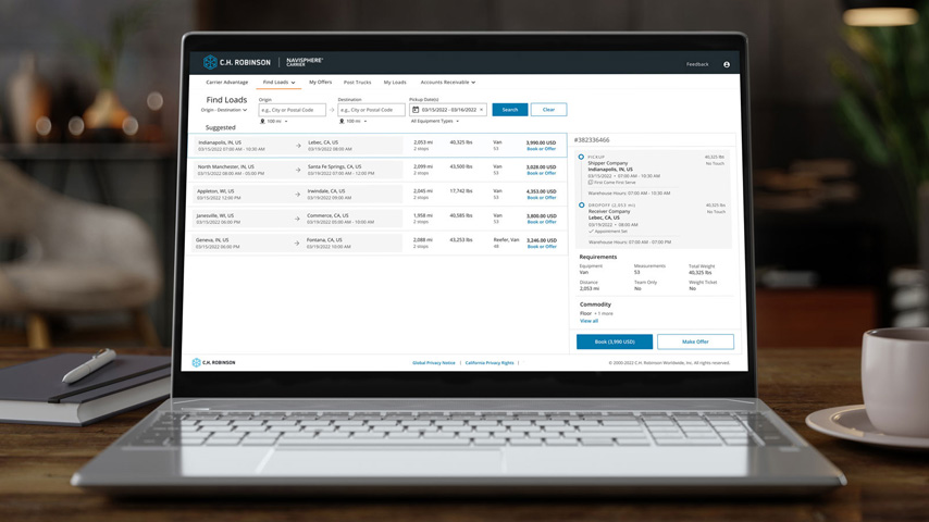 Stay productive anywhere and manage everything on the go. See recommended loads, digitally make offers, and book freight from your phone.